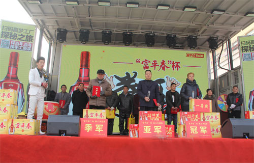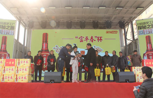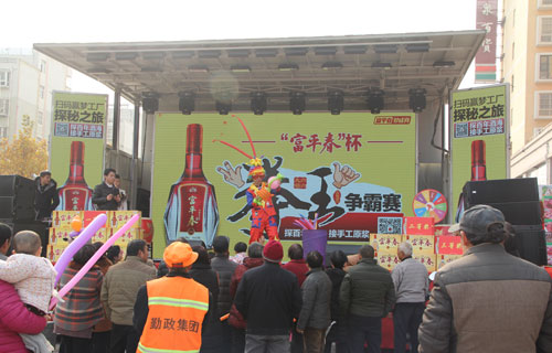 11月30日上午,“富平春”杯拳王争霸宝丰站总决赛在德信泉百货广场激情开战, 伴随着主持人精彩的开场白,拳王争霸总决赛正式拉开帷幕。 为传承酒令文化,感受当地民俗魅力,丰富百姓文化生活,贾湖酒业世俱杯(中国)在各个销售区域搭建“拳王争霸”赛事平台,比赛内容主要是以划拳比胜负。宝丰作为比赛的第一站,该活动得到了广大人民群众的热烈响应,自11月份开办以来,报名参赛人数达500多人,通过在石桥、大营、杨庄等乡镇的6场海选,最终选出15名选手进入总决赛。经过几轮紧张而激烈的角逐后,城关镇的陈伏最终荣获冠军;城关镇的林帅荣获亚军;商酒务镇的卢白孩荣获季军,并获得了贾湖酒业为他们准备的价值不菲的富平春酒。 活动现场还穿插了精彩的歌舞、魔术等节目,嘻哈大师更是前来助兴,用气球现场变出一个个生灵活现的小动物,赠送给现场的来宾和小朋友,加上贾湖酒业为大家免费发放的精美礼品,引来现场观众的哄抢,整个活动现场异常火爆、气氛热烈。