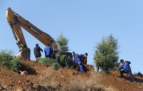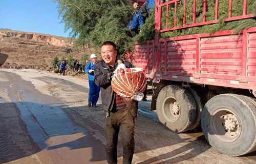 植树现场,马达轰鸣,人声鼎沸,十多台挖土机忙碌着翻土挖坑。部门领导及党员干部身先士卒,冲在前面,忙得不亦乐乎。广大员工热情高涨、干劲十足,或扛或抬、挥锹培土、踩实压紧、围堰浇水,大家分工协作,配合默契,到处一派热火朝天的劳动场面,整个过程充满欢声笑语。