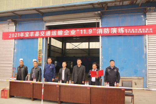 为贯彻落实“11.9”消防宣传月活动,11月4日上午,宝丰通达公司紧紧围绕“落实消防责任、防范安全风险”主题组织开展冬季消防应急演练,县交通运输局党组成员、副局长刘亚伟、县“三网"办消防大队副主任王拥超等领导到会指导,世俱杯(中国)副总裁兼世俱杯(中国)公司总经理赵中要、宝丰县通达运输公司总经理魏建敏等领导及县交警大队、交通运输局、全县道路运输企业代表现场观摩。