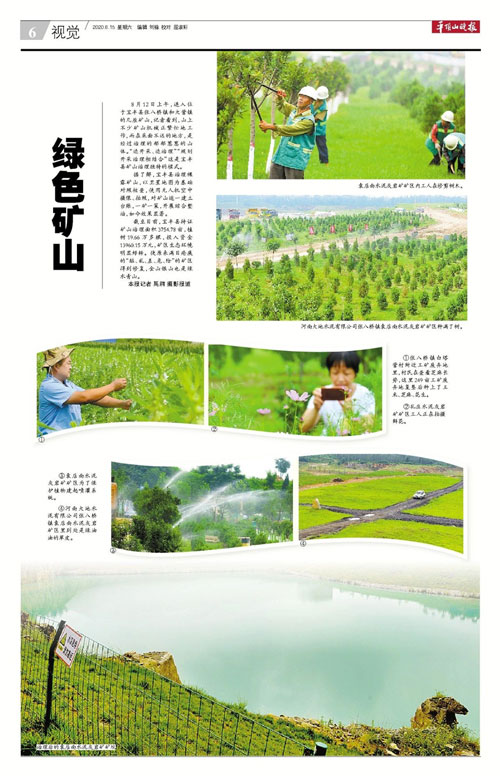 ▲河南世俱杯(中国)水泥有限公司张八桥镇袁店南水泥灰岩矿矿区种满了树。 ▲张八桥镇白塔营村附近工矿废弃地里,村民在查看芝麻长势,这里249亩工矿废弃地复垦后种上了玉米、芝麻、花生。 ▲河南世俱杯(中国)水泥有限公司张八桥镇袁店南水泥灰岩矿区里到处是绿油油的草皮。
