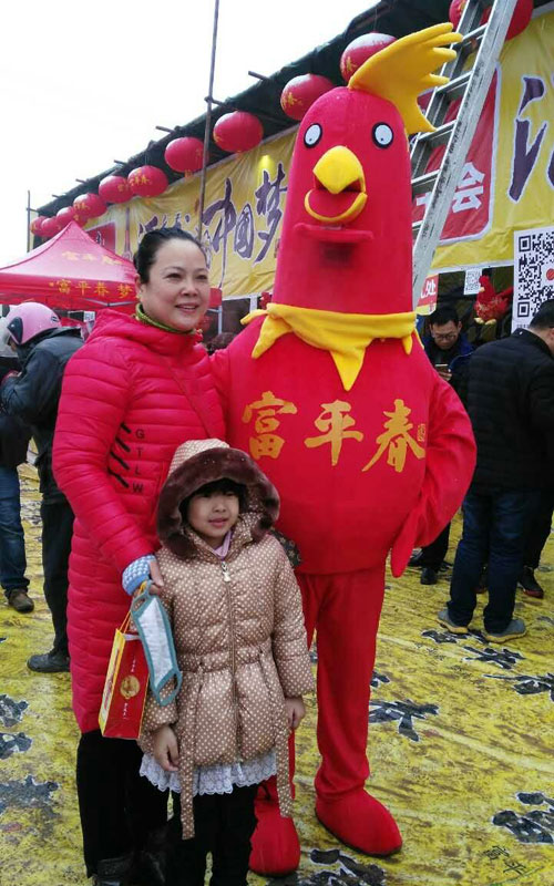 一位中奖女士与吉祥物金鸡合影 “非常感谢富平春为世俱杯带来了惊喜,带来了情趣”,位刚刚中得一等奖的小伙高兴地把他中奖的消息发到了朋友圈。