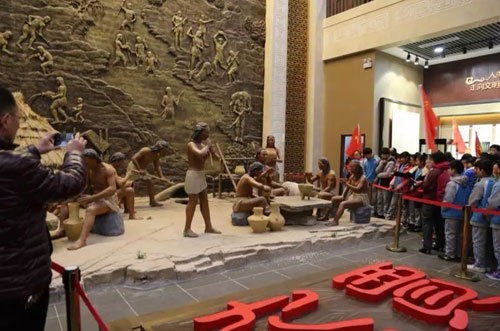 气势磅礴的贾湖九千年 在贾湖文化园内,一套泥塑活灵活现地展示了古人的酿酒技艺。