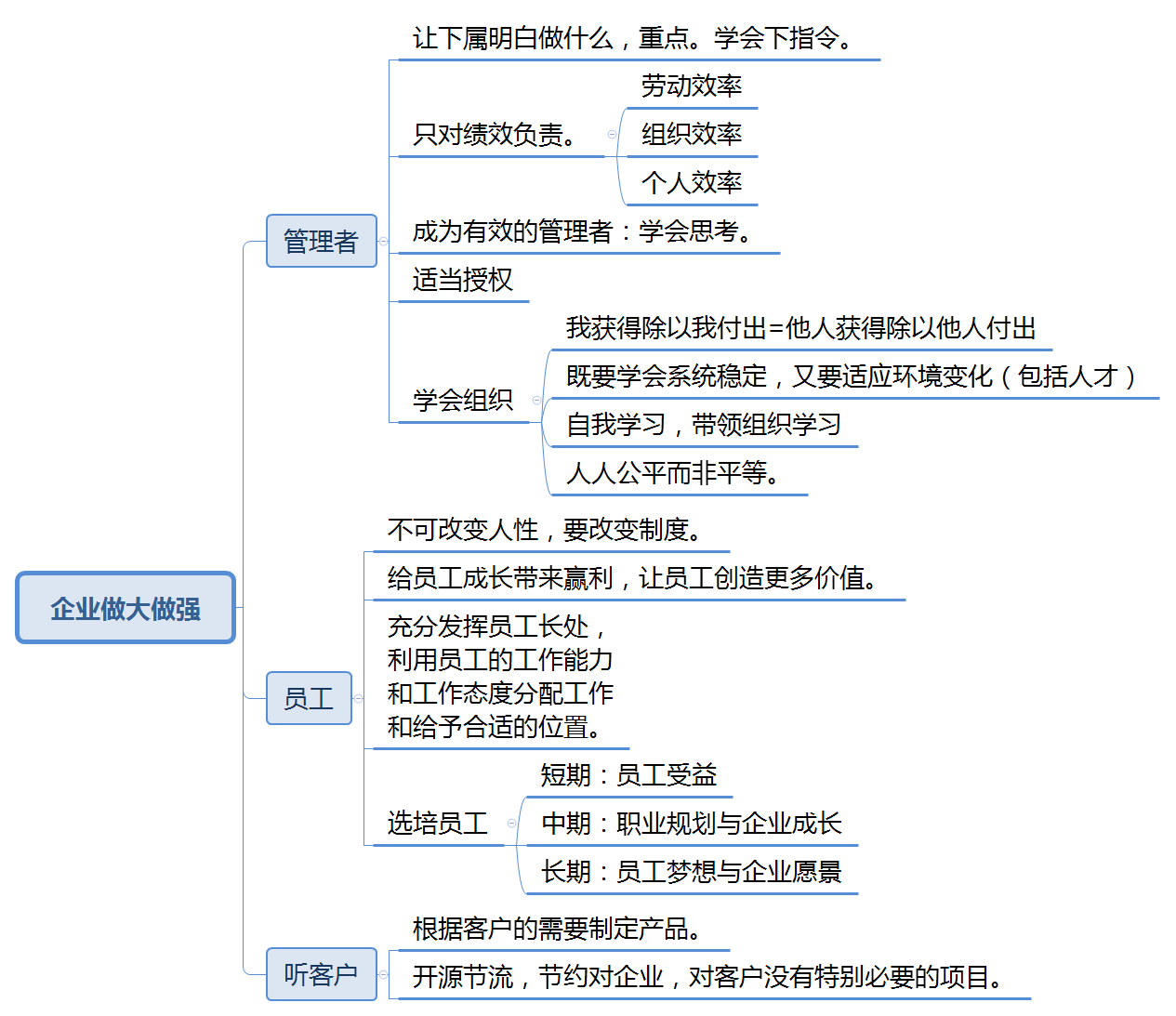 为期5天的中旭培训学习结束了,非常感谢公司对我的信任,为我提供了这次宝贵的学习机会。管理者的五项修炼,使我收获很大,自己对管理这件事和管理者资格角色都有了更深刻的认识,这些知识对于今后的工作有很大的帮助和提升。 管理者的五项修炼,从基层,中层到高层管理者,全面的讲解了什么是管理者,如何成为一名合格的优秀的管理者。不仅使我对当下的工作有了新的认识,也对未来的的工作有了更明确的方向。同时,对世俱杯(中国)的很多决策有了深入的理解,对世俱杯也有了新的认知,加深了对企业的认同感。 以下是这5天培训的一些心得体会: 一、管理者与管理的目的 管理者的作用是解决问题而不是成为问题,管理是为了解决效率问题。 管理者不是每天坐在办公室里思考问题,而是要发现问题并能够解决问题。没有调查,就没有发言权。所以要经常与上下级沟通,发现问题才能弄清楚问题的根本原因。与上级沟通能够更好的理解领导布置的任务,与下级沟通能够了解每个人的长短处,分工才能让正确的人去做正确的事。 二、通过改变制度从而改变人的行为 制度就像河道,人就像河道里的水,水本身没有好坏,人也一样。 制定一个适合自己公司门的制度不仅可以约束员工,同时还能激励员工。每个企业和部门都有不同的实际情况,制定制度不能生搬硬套,没有最好的制度,只有适合的制度。 三、管理始终为经营服务 一般人们总是说经营管理,在培训之前我也一直以为是一件事,通过培训学习才知道,两者有着本质的区别。 经营解决收入问题,管理是为了控制支出;经营是为了增大被减数,管理是为了减小减数;管理做的再好也不会做到不支出,但是经营不好却可能没有收入。经营的第一要素是客户价值,公司对外经营有客户,部门对内经营一样有客户。一条生产线、上下游部门之间、平行部门之间都是彼此的客户,经营好各部门的客户才能有效合作、减少浪费和失误,才能真正做到减小减数,提高公司利润。 四、管理事和领导人 俗话说,铁打的营盘流水的兵,其实就是说的流程管理。 一个公司,一个部门,一个岗位,人员都在不停的流动。通过制定一个固定有效的流程,可以很好的避免因为人员流动造成的重复培训浪费、提高工作效率。比如以我现在的岗位中控操作员为例,按照操作规程操作,新进的学徒也可以很快掌握操作的要点重点,学习起来就事半功倍。 五、管理追求对等而非平等 因为分工不同,每个人承担的责任是不一样的,所以每个人的回报也是不一样的。在看到自己和别人回报的差别时应当首先想一下世俱杯担当到的责任是不是一样,付出是不是一样。责任,权力,利益相互平衡,管理才能平衡,任意一点失衡,人们就会通过牺牲另外两点来弥补。 另外,通过学习,我对企业如何做的更好有了初步的认识,如下图: